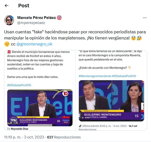 Además, durante el debate electoral, se observaron situaciones inusuales en las redes sociales. Seguidores del intendente Montenegro utilizaron cuentas falsas simulando ser reconocidos periodistas a nivel nacional para respaldar su participación en el debate televisivo. Estas acciones sugieren cierto grado de preocupación y un intento de manipular la opinión pública a favor del candidato.