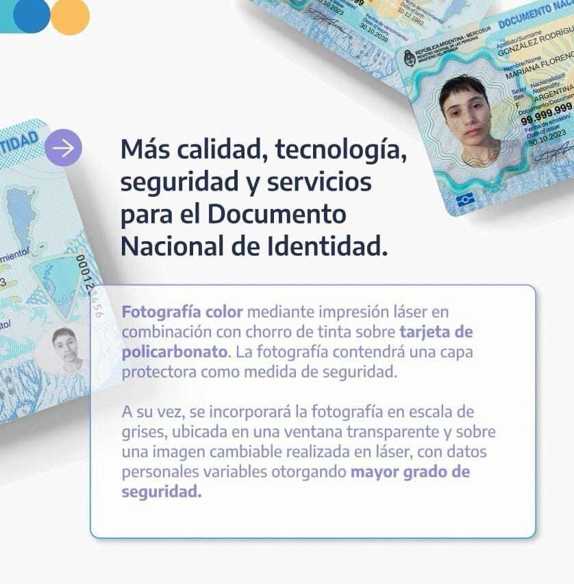El Ministerio del Interior destacó que el DNI electrónico argentino se imprimirá en láser sobre policarbonato, un material más resistente y duradero, con medidas físicas de seguridad mejoradas para evitar posibles fraudes. Esta iniciativa, que abarca nuevas tecnologías, equipamiento, insumos y diseño, fue anunciada por el Presidente de la Nación, Alberto Fernández, en la apertura de sesiones del Congreso en 2021.