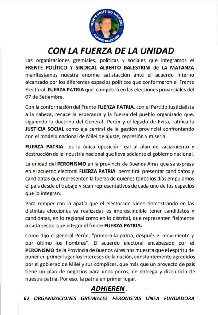 Desde el Frente Balestrini aseguran que esta unidad no es solamente una estrategia electoral, sino una manifestación del compromiso histórico del peronismo con el pueblo argentino. Frente a un contexto adverso, el surgimiento de Fuerza Patria representa para muchos una señal de que aún es posible construir desde la unidad una respuesta sólida, popular y transformadora.