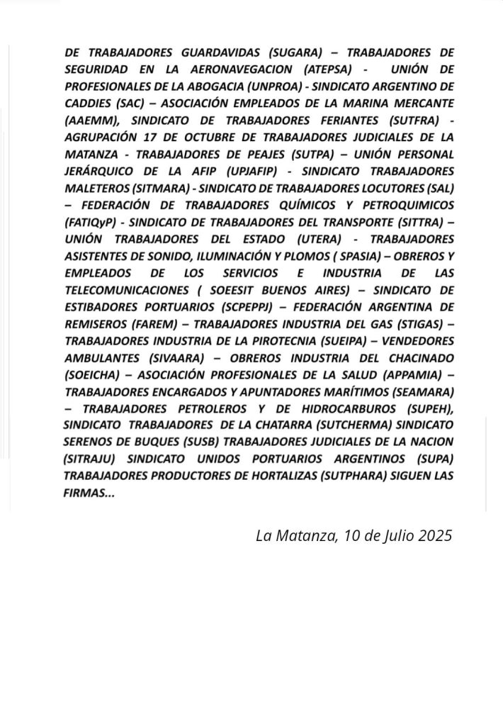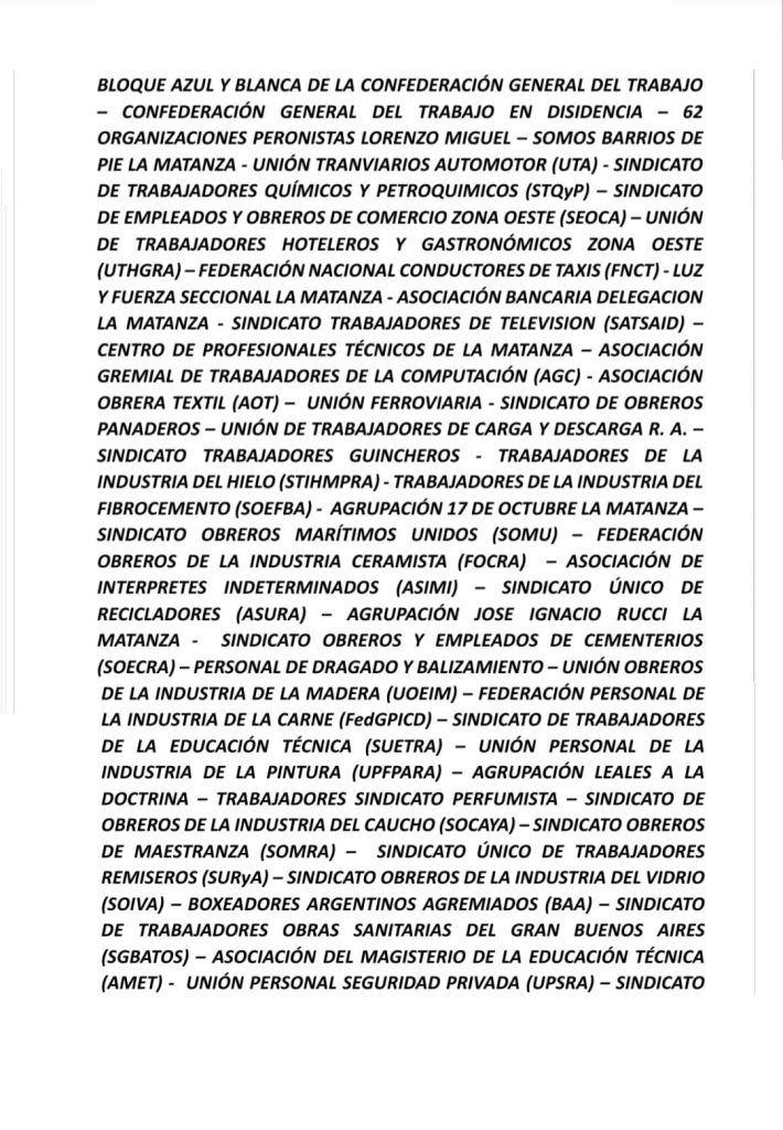El acuerdo cuenta con el respaldo de numerosas entidades sindicales como la UTA, STIHMPRA, SOEFBA, FOCRA, UTHGRA, AOT, SUETRA, SATSAID, entre muchas otras, lo que refuerza su anclaje en el movimiento obrero organizado.